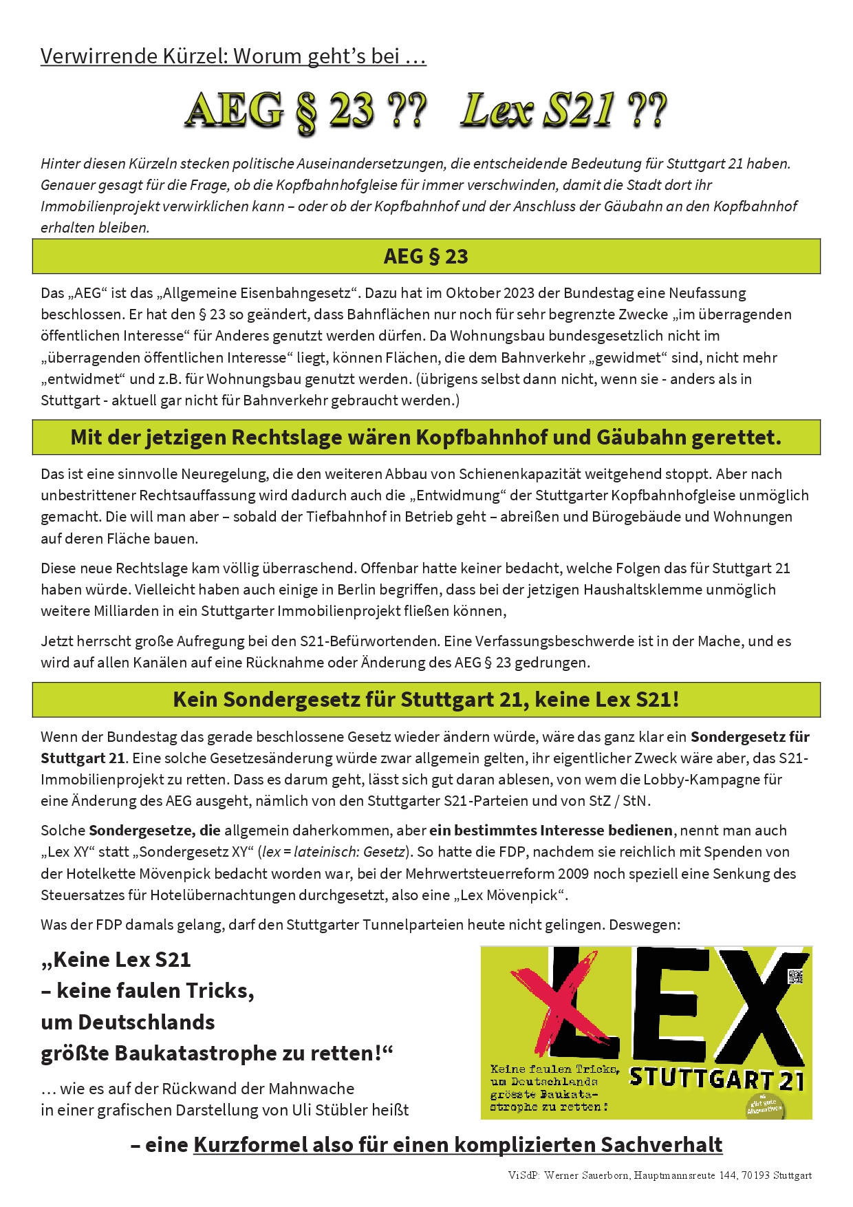 der Stuttgarter Oberbürgermeister, Herr Dr. Frank Nopper hat Ihnen, dem Bundesverkehrsminister und den baden-württembergischen Bundestagabgeordneten am 30. August einen Brief geschrieben, um die Ende letzten Jahres in Kraft getretene Novellierung des § 23 Allgemeines Eisenbahngesetz wieder rückgängig zu machen bzw. eine Art Sondergesetz für Stuttgart 21 („Lex S21“) zu erwirken.