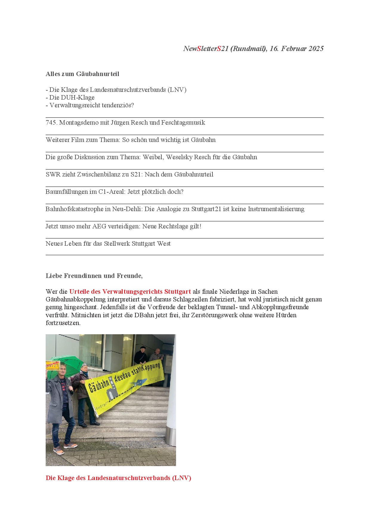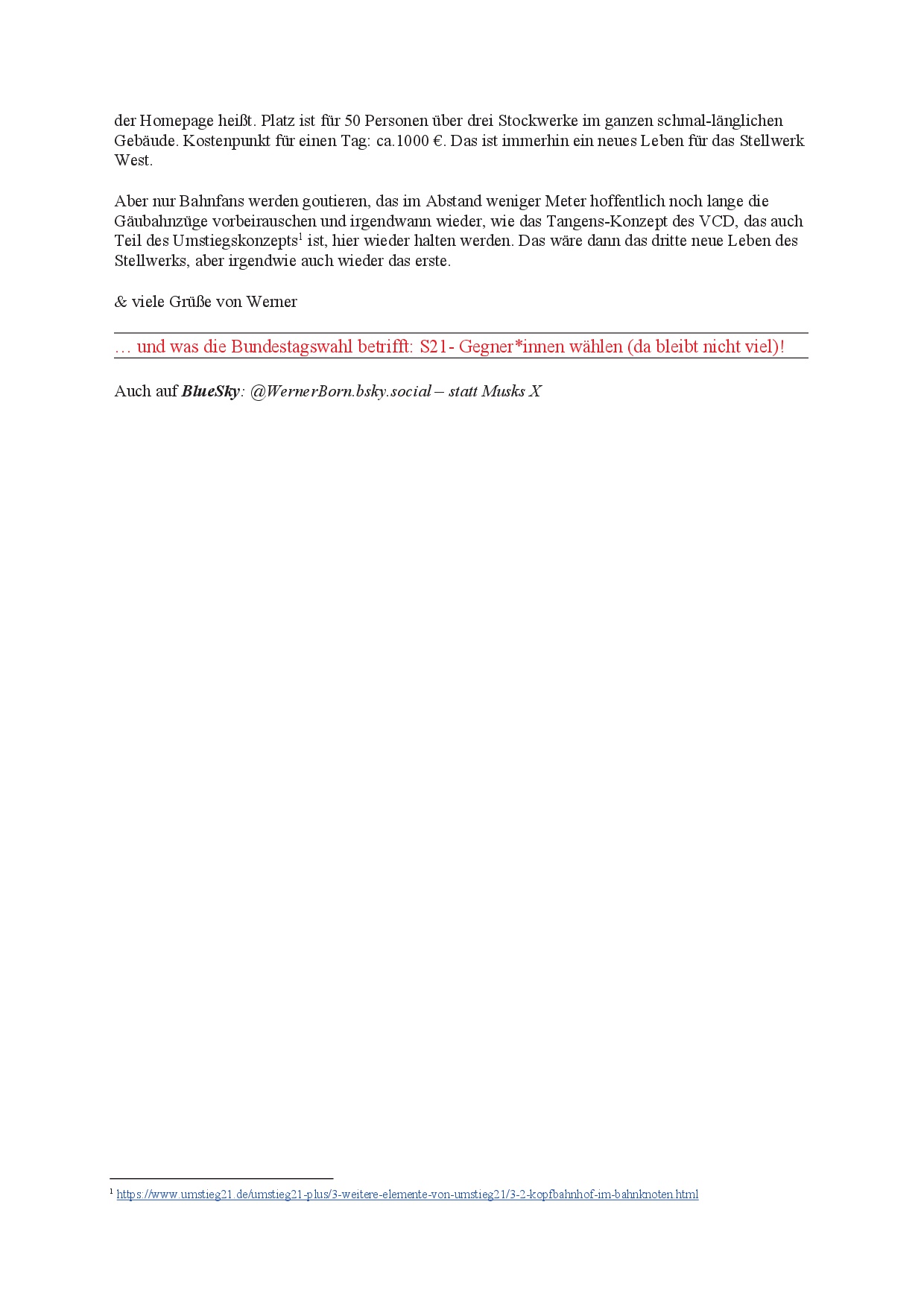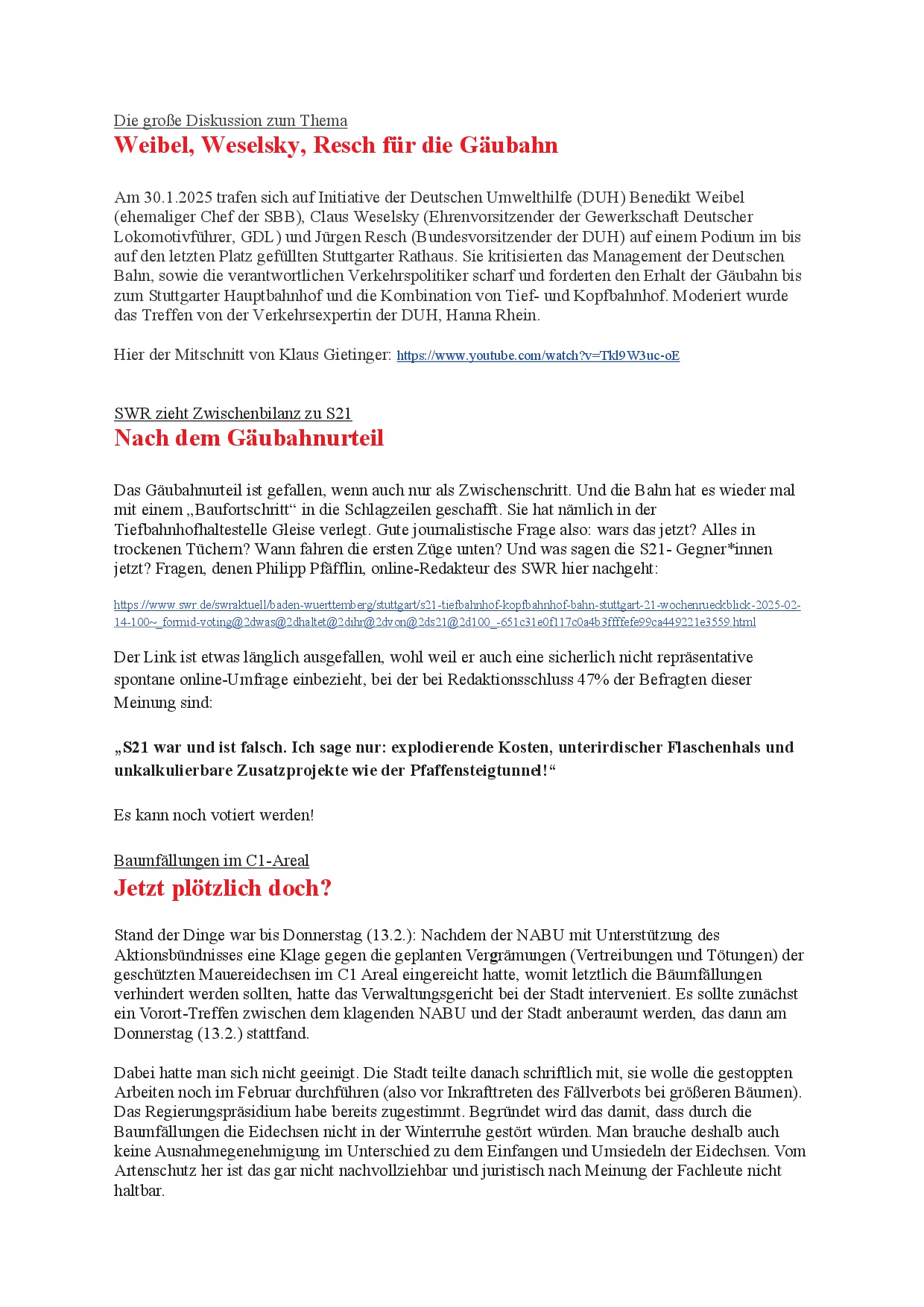 newS21letter (Werners Rundmail) vom 16.2.25 17. Feb.. 2025 (hier der NewS21letter als pdf-Datei) (und hier der darin erwähnte SÖS-Beitrag zur AEG-Anhörung)