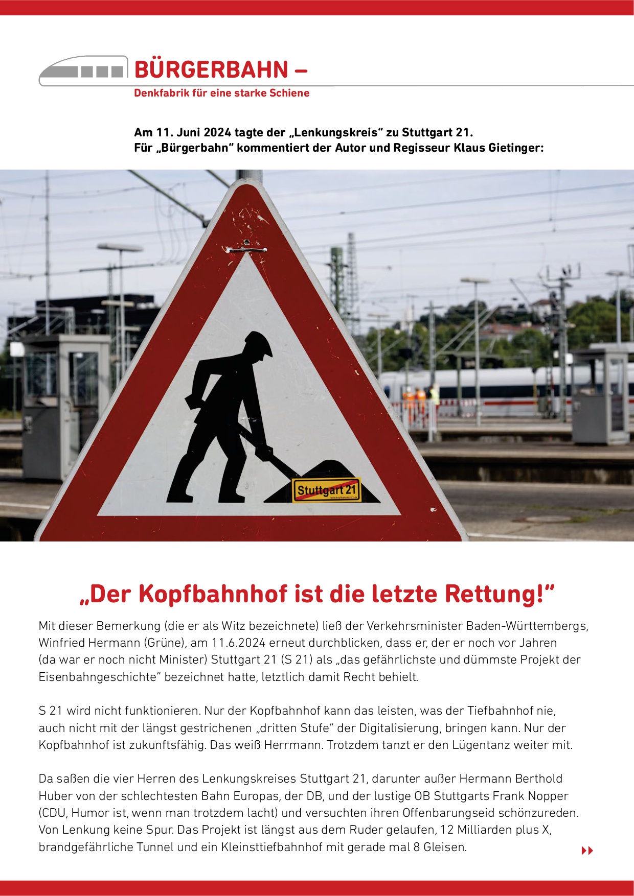 Der Kopfbahnhof ist die letzte Rettung! (Pressemitteilung von Bürgerbahn) 14. Juni. 2024 (hier diese Pressemitteilung als pdf-Datei)
